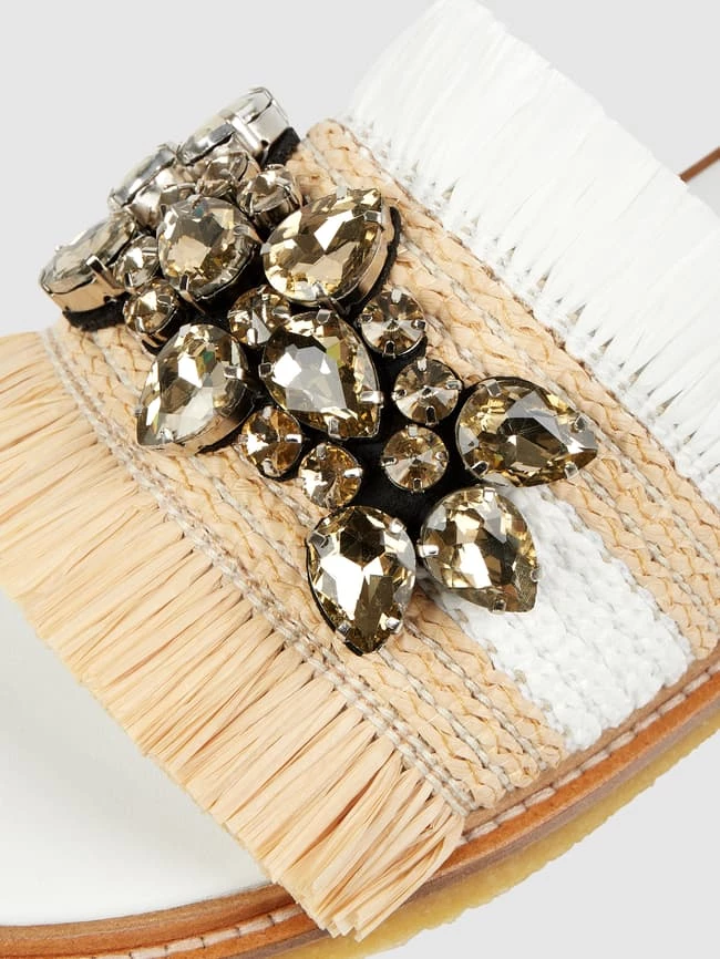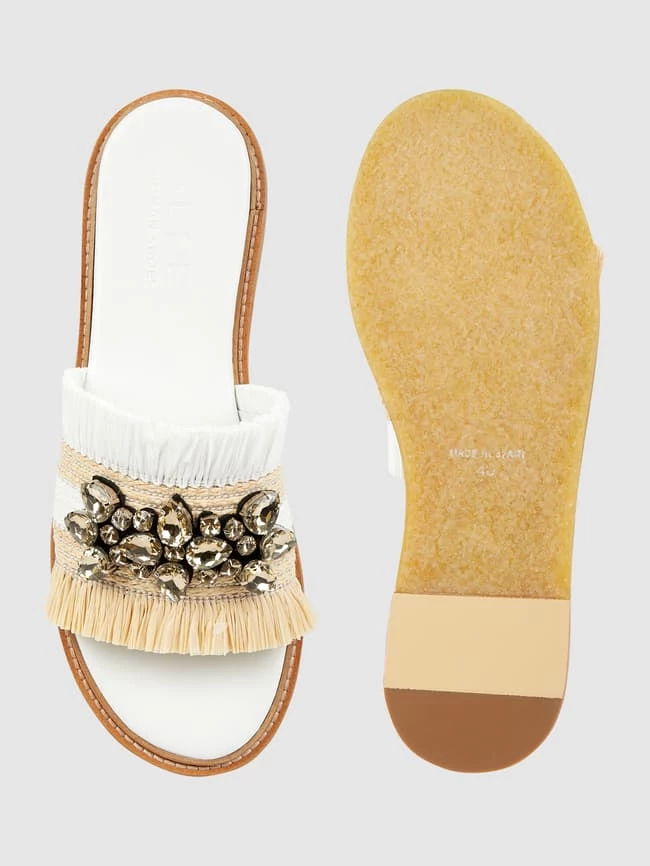 Die Pantolette von Alpe ist aus echtem Leder gefertigt. Sie kommt mit Strasssteinen, Fransen und Innensohle aus Leder.