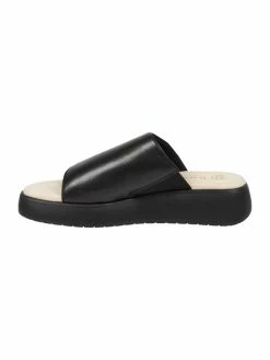 Die Pantolette von Bugatti ist aus echtem Leder gefertigt. Sie zeigt sich in abgerundeter Form mit breitem Riemen und Plateausohle aus Gummi.