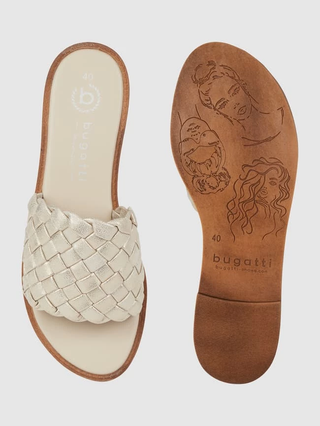 Die Pantolette von bugatti ist aus strapazierfähigem Material gefertigt. Sie kommt in Flecht-Optik mit Gummisohle und glatter Innensohle.