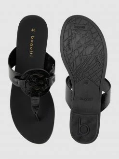 Die Zehentrenner von bugatti zeigen sich in Lack-Optik. Sie kommen mit breitem Riemen und Logo.