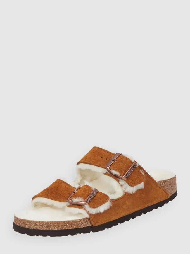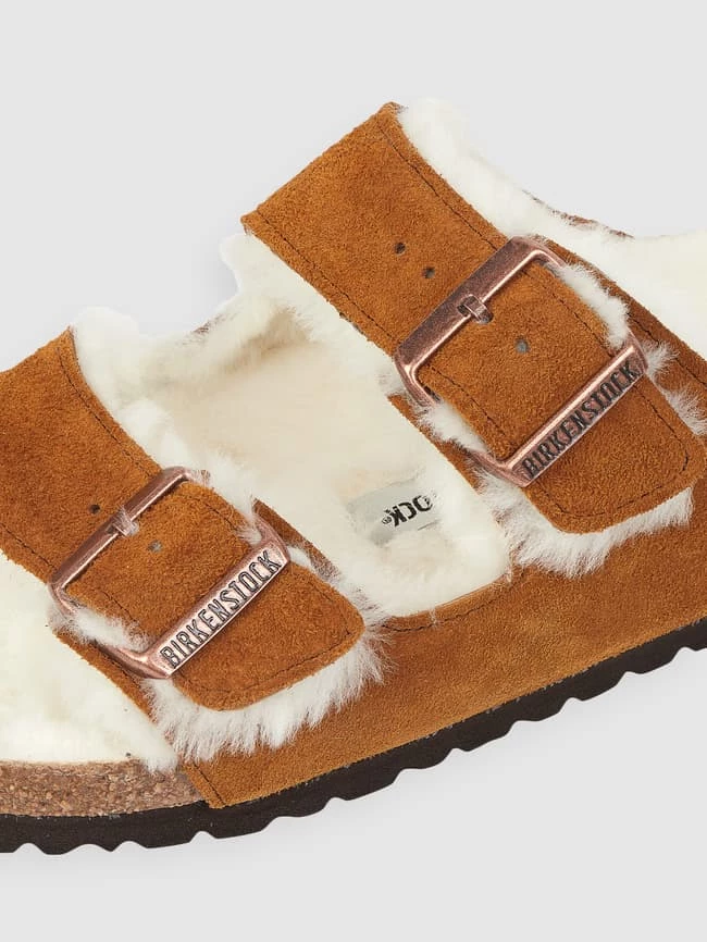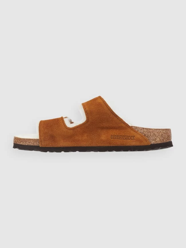 Die Sandalen von BIRKENSTOCK sind aus Veloursleder gefertigt. Sie zeigen sich mit verstellbaren Riemen, Innensohle aus Lammshearling und ergonomischem Fußbett aus Naturkork.