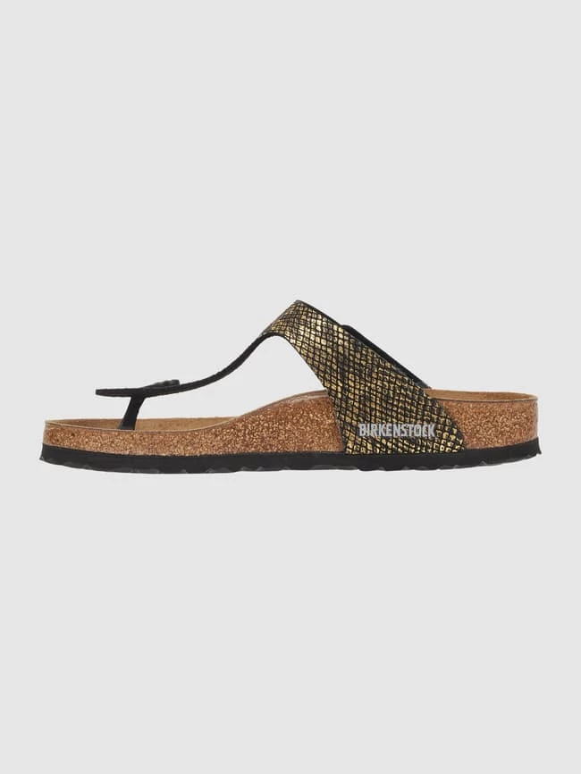 Die Zehentrenner von BIRKENSTOCK sind aus Mikrofaser gefertigt. Sie kommen in Snake-Optik mit verstellbarem Riemen, Innensohle aus Leder und ergonomischem Fußbett aus Naturkork.