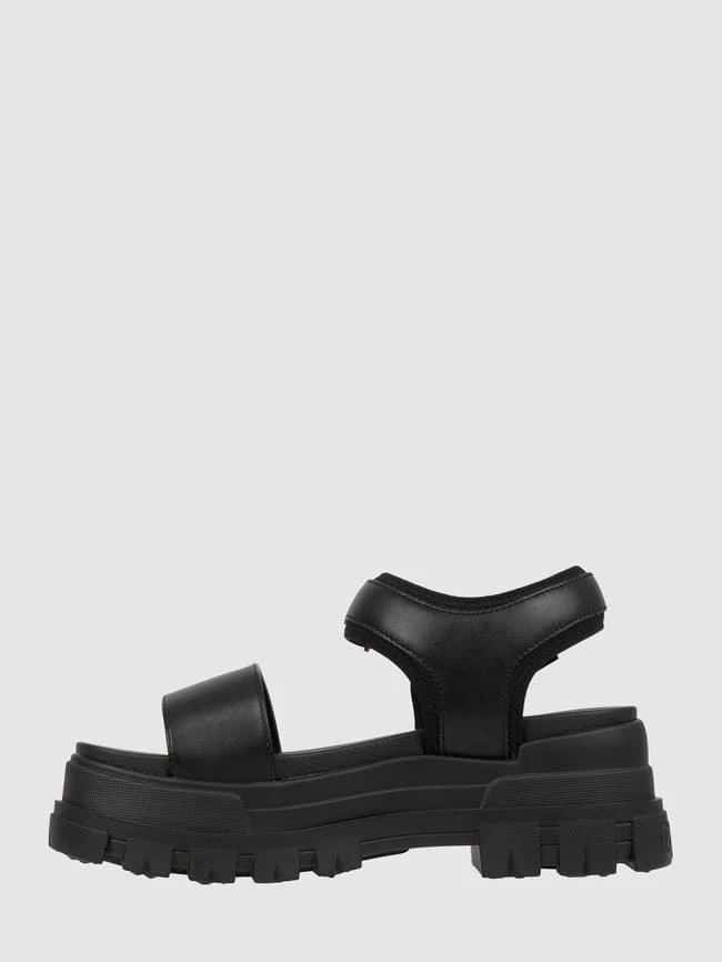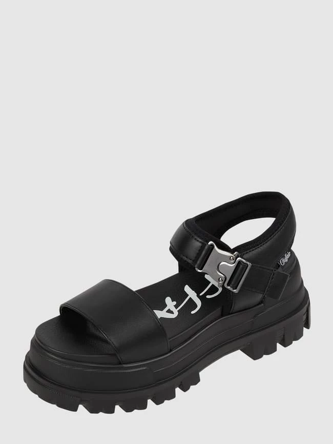 Die Sandalen von Buffalo zeigen sich in Leder-Optik. Sie kommen mit breitem Riemen, Klickverschluss und Plateausohle aus Gummi.