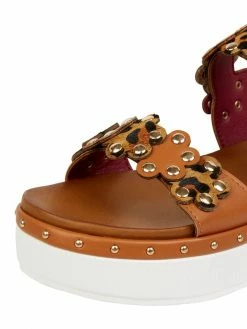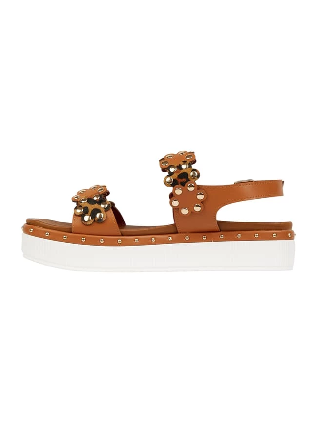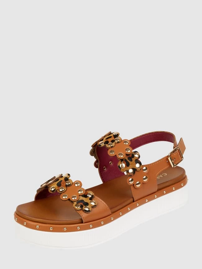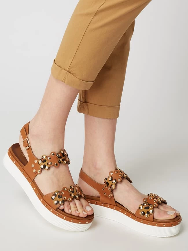 Die Sandalen von CAFèNOIR zeigen sich in Leder-Optik. Sie kommen mit Fesselriemen, Applikationen und Nieten.