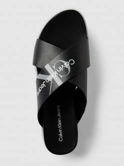 Die Pantolette von Calvin Klein Jeans ist aus echtem Leder gefertigt. Sie zeigt sich mit Plateausohle, gekreuzten Riemen und Label-Print.