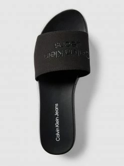 Die Slides von Calvin Klein Jeans sind aus reiner Baumwolle gefertigt. Sie zeigen sich mit Label-Schriftzug und Plateausohle sowie Kontraststreifen mit Logo-Details und breiten Riemen.
