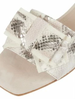 Die Pantolette von CINQUE ist aus echtem Leder gefertigt. Sie zeigt sich mit Zierschleife, Schlangenmuster und Ledersohle.