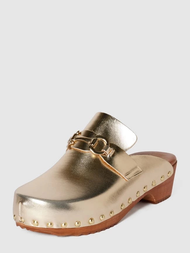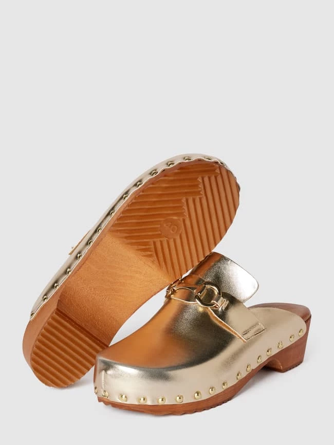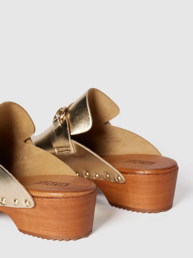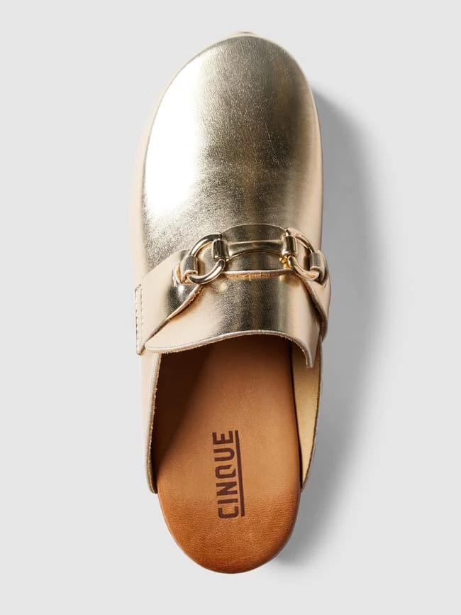 Die Pantoletten von CINQUE sind aus strapazierfähigem Material gefertigt. Sie kommen mit abgerundeter Spitze, Zierriegel sowie Applikation und Zierbesatz in metallic.