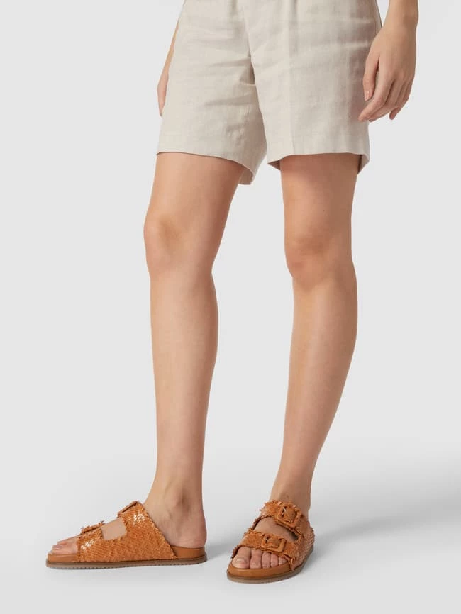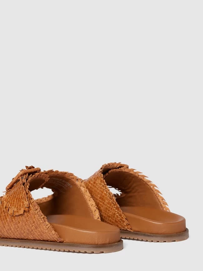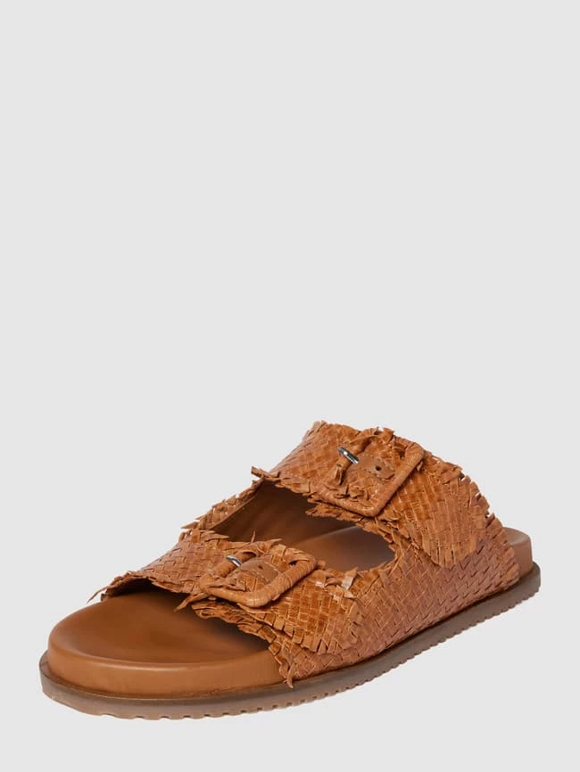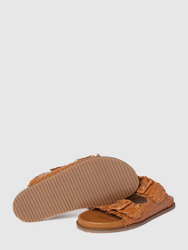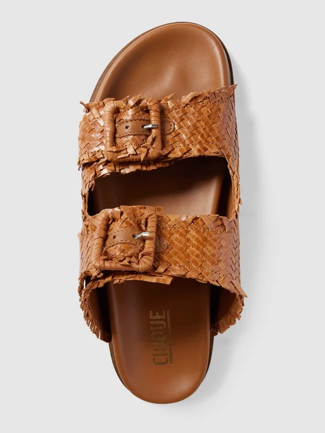 Die Slides von CINQUE sind aus echtem Leder gefertigt. Sie zeigen sich mit ausgefranstem Strukturmuster in Flecht-Optik sowie breiten Riemen mit Dornschließe und strukturierter Sohle.