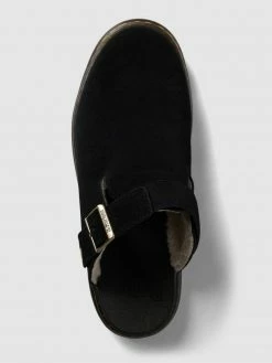 Die Pantoletten von Dr. Martens sind aus reinem Leder gefertigt. Sie zeigen sich in Velours-Optik und kommen mit Futter aus Teddyfell, verstellbarem Riemen sowie Kontrastnähten.