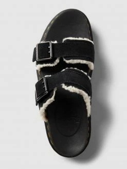 Die Pantoletten von Dr. Martens sind aus reinem Leder gefertigt. Sie zeigen sich im unifarbenen Design und kommen mit verstellbaren Riemen, Teddyfell-Futter und strukturierter Sohle.