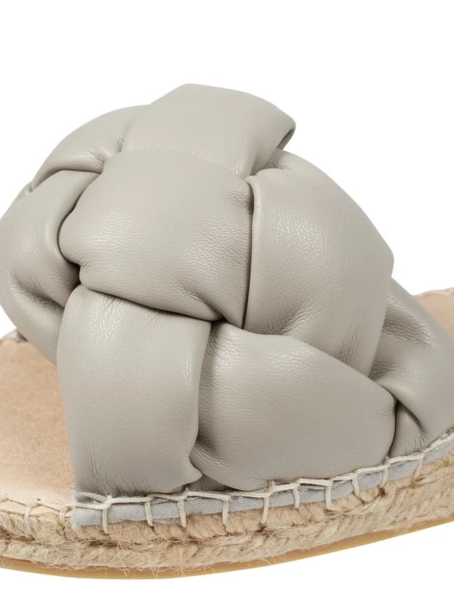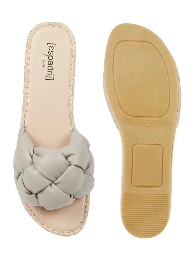 Die Pantolette von Espadrij l’originale® zeigt sich in Leder-Optik. Sie kommt mit breitem Riemen, Besatz in Flecht-Optik und Gummisohle.