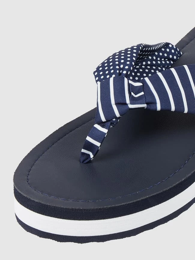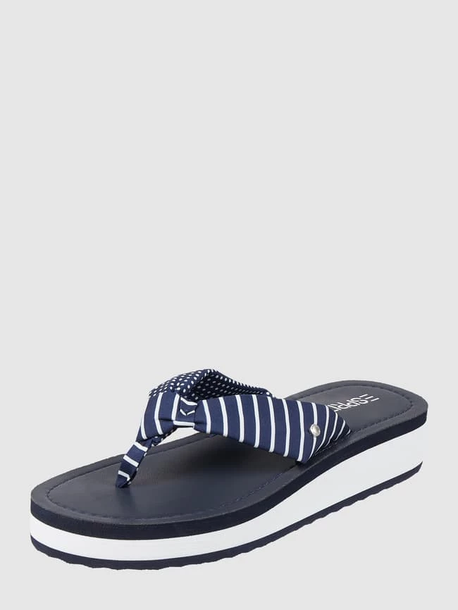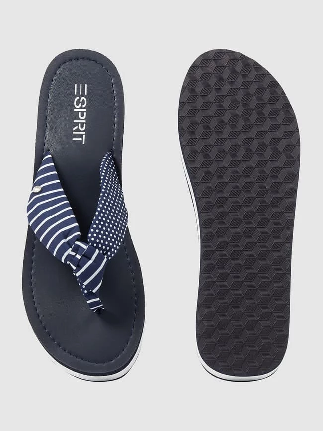 Die Zehentrenner von Esprit sind aus Textil gefertigt. Sie zeigen sich mit Mustermix, Logo und Plateausohle.