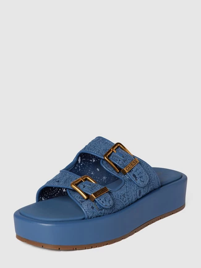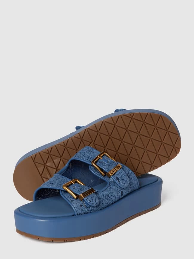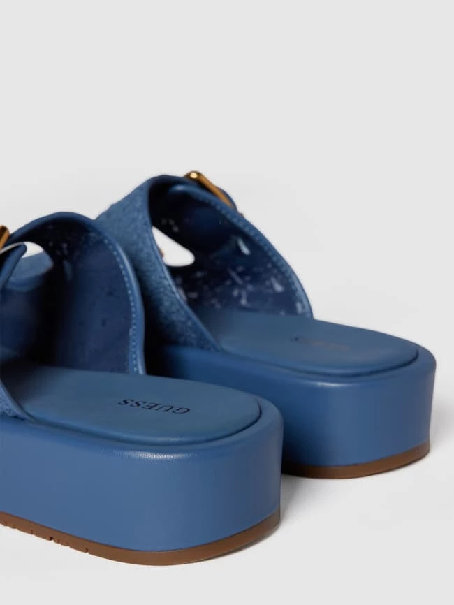 Die Pantoletten von GUESS sind aus strapazierfähigem Material gefertigt. Sie kommen im unifarbenen Design mit Plateausohle, Dornschließen, Zierbesatz und leicht strukturierter Sohle.
