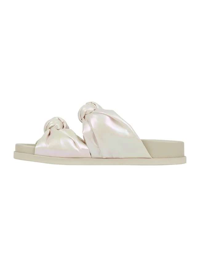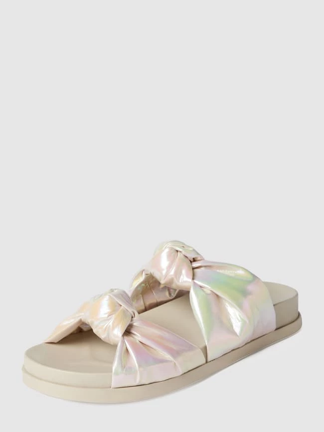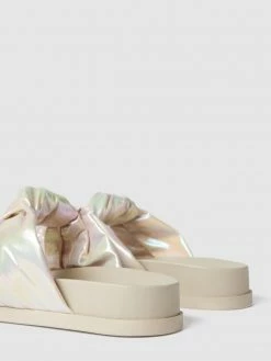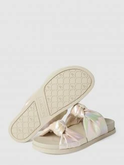 Die Slides von Marc Cain Bags & Shoes sind aus schimmerndem Material gefertigt. Sie zeigen sich mit breiten Riemen und Knoten-Details sowie leicht strukturierter Sohle.
