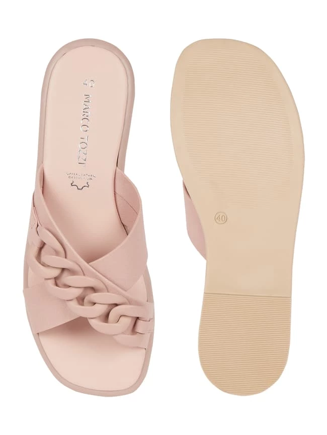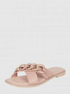 Die Pantolette von Marco Tozzi ist aus Leder gefertigt. Sie zeigt sich mit gekreuzten Riemen, Kettendetail und Gummisohle.