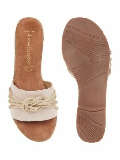 Die Pantolette von Marco Tozzi ist aus Leder und Textil gefertigt. Sie zeigt sich mit breitem Riemen, Knotendetail und Innensohle aus Leder.