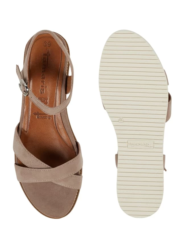 Die Sandalen von Tamaris sind aus echtem Leder gefertigt, Sie kommen mit gekreuzten Riemen, Keilabsatz und TOUCH it-Fußbett.