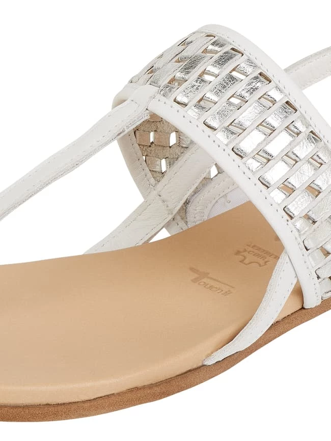Die Zehentrenner von Tamaris sind aus echtem Leder gefertigt. Sie kommen mit Riemen in Metallic-Optik, Fesselriemen und TOUCH it-Fußbett aus Leder.