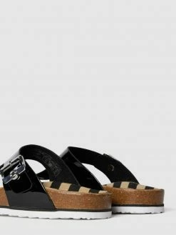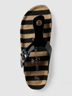 Die Zehentrenner von TOM TAILOR sind aus robustem Material gefertigt. Sie kommen in Lack-Optik mit Dornschließe, Label-Detail und profilierter Sohle sowie breitem Riemen.