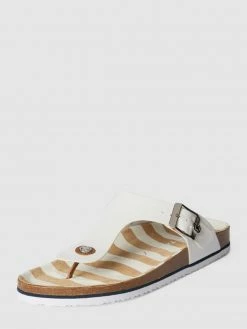 Die Zehentrenner von TOM TAILOR sind aus robustem Material gefertigt. Sie kommen in Lack-Optik mit Dornschließe, Label-Detail und profilierter Sohle sowie breitem Riemen.