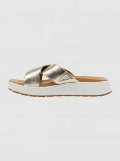 Die Pantolette von UGG Australia ist aus echtem Leder gefertigt. Sie kommt in Metallic-Optik mit gekreuzten Riemen und kleiner Logo-Niete.